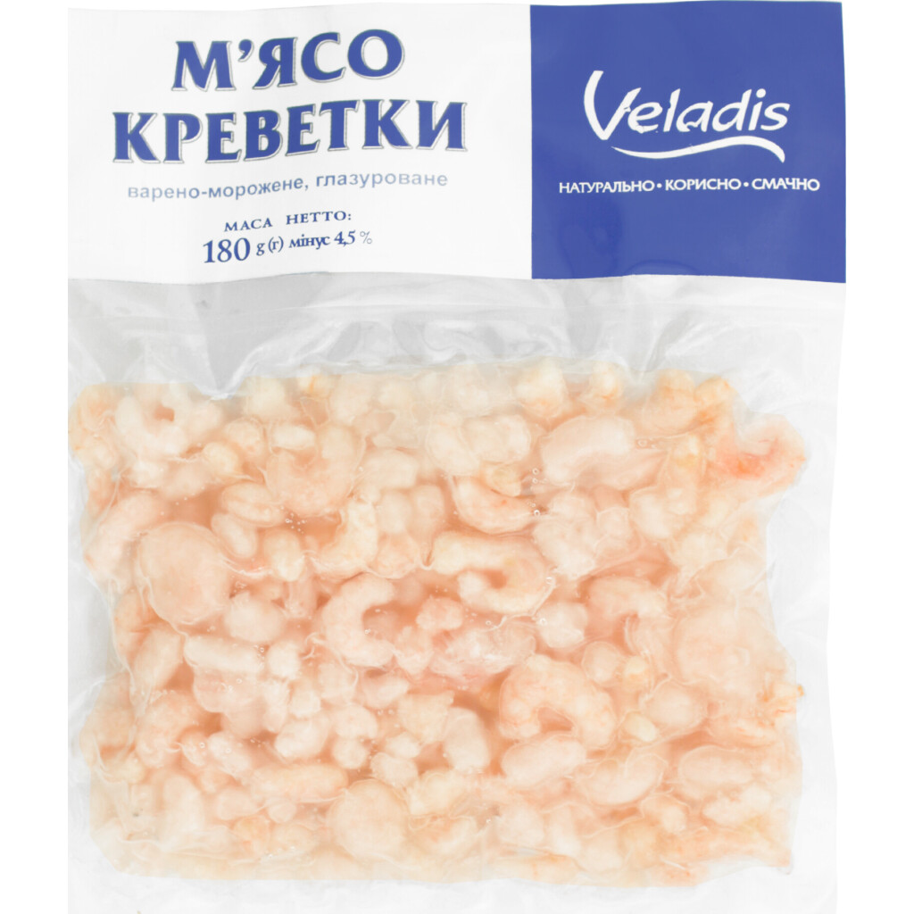 Мясо креветки Veladis глазированное в/м, 180г (4823097901557)Состав Мясо креветки варено-мороженное, питьевая вода (защитная ледовая оболочка)