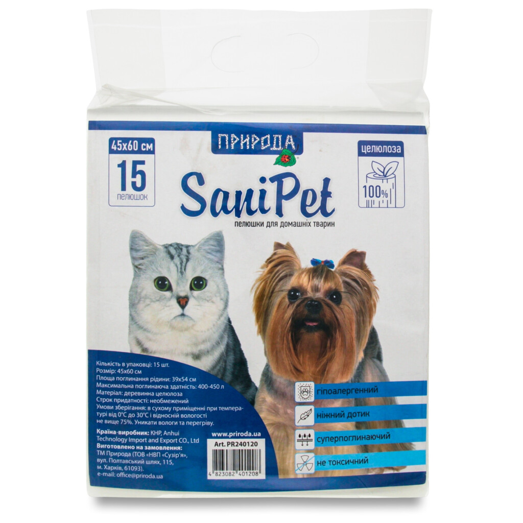 Пеленки для собак SaniPet 60*45 см, 15шт/уп (4823082401208)Площадь поглащающая жидкость: 39х54см.Максимальная поглащающая способность: 400-450л.Материал: древесная целлюлоза.Срок хранения: неограниченный.